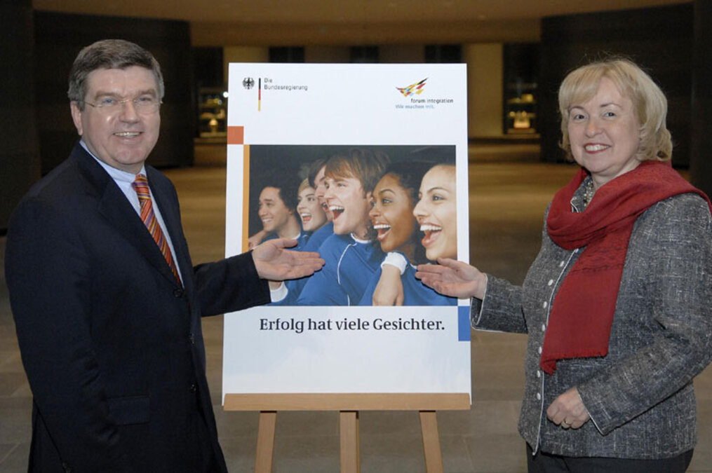 Sportlerinnen und Politiker unterstützen und fördern die Initiative der Bundesregierung. Die Staatsministerin machte zu Beginn einer dreistündigen Anhörung im Bundeskanzleramt deutlich, dass der Erfolg der Kampagne "Integration. Wir machen mit!" auch vom Engagement des organisierten Sports abhängt. "Wir haben uns heute ausführlich mit der Frage beschäftigt, wie wir die Erfahrung aus den Sportvereinen noch besser in den Integrationsplan einbringen können", sagte Böhmer. DOSB-Präsident Thomas Bach versicherte der Staatsministerin die Unterstützung des Sports: „Wir finden die Initiative der Bundesregierung richtig und wichtig und werden uns mit unserem Programm „Integration durch Sport“ aktiv an den weiteren Maßnahmen beteiligen.“