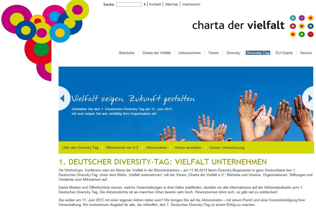 Der Verein Charta der Vielfalt e.V. hat auf seiner Internetseite die virtuelle Aktionslandkarte freigeschaltet. Der Verein erwartet über 250 Aktionen, die auf der Landkarte eingetragen werden. „Wir rufen alle Unternehmen und Institutionen dazu auf, eine Aktion zum 1. Deutschen Diversity-Tag anzumelden – und somit öffentlich zu zeigen, was Vielfalt für sie bedeutet und welche Chancen darin sowohl für die Wirtschaft als auch für die Gesellschaft liegen“, sagte die Geschäftsführerin des Vereins, Aletta Gräfin von Hardenberg. Auch Vereine sind zur Teilnahme aufgefordert.