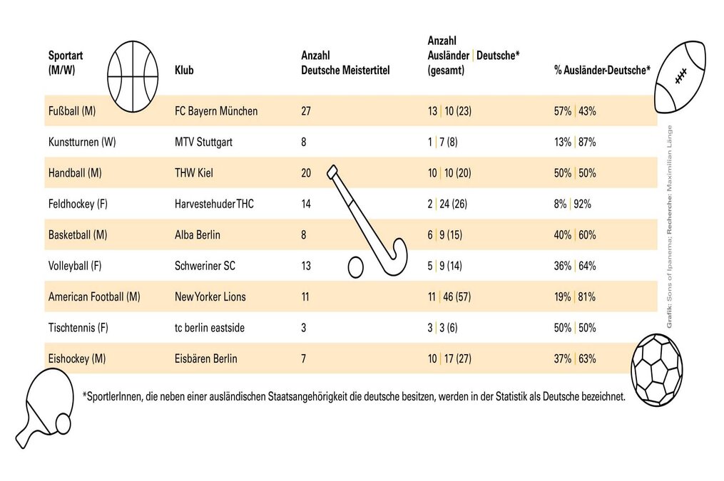 Die Handballer des THW Kiel laufen in der aktuellen Saison mit Spielern aus sechs Nationen auf. Neben zehn Deutschen gehen Spieler aus Dänemark, Kroatien, Schweden, Serbien und Österreich für den Rekordmeister der Handball-Bundesliga auf Torjagd. Ähnlich ausgeglichen ist die Quote beim dreimaligen deutschen Tischtennis-Meister der Frauen, ttc berlin eastside. Auf drei deutsche Spielerinnen kommen zwei Japanerinnen und eine Ungarin.