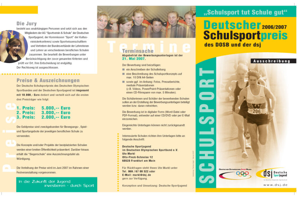 Die Bewerbungsunterlagen sind bis 21. Mai 2007 an die Deutsche Sportjungend im Deutschen Olympischen Sportbund e.V. , Frau Ute Markl, Otto-Fleck-Schneise 12, 60528 Frankfurt am Main zu senden.