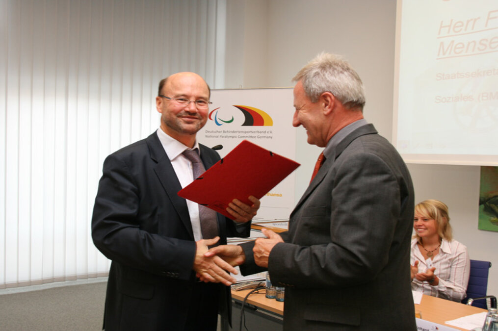 Die geladenen Gäste aus Gesellschaft, Politik und Sport wurden von der Projektleitung des DBS und der Modellregionen (Rheinland-Pfalz, Sachsen-Anhalt, Schleswig-Holstein und Nordrhein-Westfalen) auf die geplante Umsetzung der verschiedensten Bausteine der Modellmaßnahme eingestimmt. „Ich freue mich, dass wir Ihnen heute nicht von Gold-Medaillen oder Dopingfällen berichten, sondern von dem, was unsere Vereine an der Basis schon seit fast 60 Jahren machen,“ so sagte DBS-Präsident Friedhelm Julius Beucher, der dabei auf die zweite Säule seines Verbandes neben dem populären Leistungssport anspielte, den Breiten- und Reha-bilitationssport. Franz-Josef Lersch-Mense, Staatssekretär im BMAS, erklärte: „Das Projekt als Impulsgeber kann jedoch nur die beabsichtigte Breitenwirkung entfalten, wenn alle Entscheidungsträger in unserer Gesellschaft ihren Beitrag leisten.“