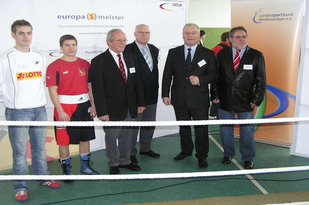 Auf der zweiten von 16 Stationen machte die DOSB-Kampagne zur deutschen EU-Ratspräsidentschaft, die europäische Themen und Ziele anhand von konkreten Projekten aus den Landessportbünden veranschaulicht, in der Halle des DJK Raspo Osnabrück Halt. Die EU stellt Maßnahmen zur Integration als Voraussetzung für eine funktionierende Gemeinschaft als Kernthema heraus. „Boxsport in der Schule“ steht für die beispielhafte Umsetzung diese Ziels: Insgesamt haben mittlerweile rund 200 Schüler aus Niedersachsen die Chance, im Rahmen von „Boxsport in der Schule“, neben körperlicher Fitneß auch Sozialkompetenz zu erwerben. Zehn Schulen im Umkreis der Box-Landesstützpunkte nehmen mit jeweils 20 Schülerinnen und Schülern am Boxprojekt teil. Es finden keine Kämpfe gegeneinander statt, trainiert wird unter fachkundiger Leitung qualifizierter Stützpunkttrainer. Die Sozialarbeiter der Schulen sind eingebunden.