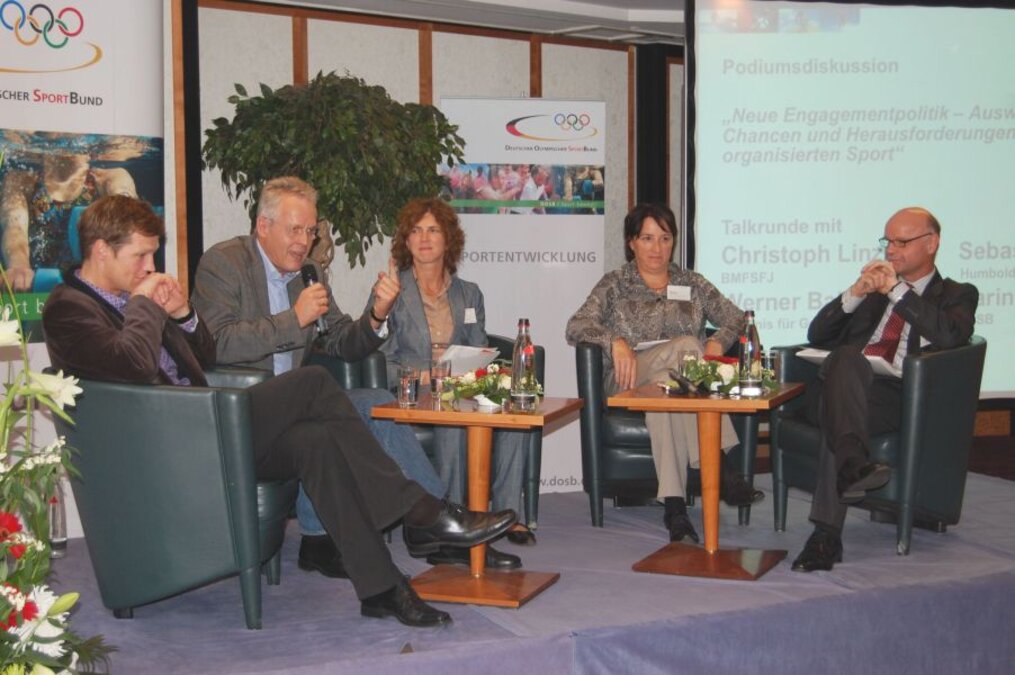 Die Podiumsteilnehmer diskutierten die Auswirkungen, Chancen und Herausforderungen der neuen Engagementpolitik auf und für den Sport. In einem Punkt waren sich alle einig: Das freiwillige Engagement leidet unter einem bürokratisierten Zuwendungsrecht: „ein dickes Brett, an dem wir gemeinsam bohren“, sagte Linzbach, verwies aber gleichzeitig auf die letzte Legislaturperiode, in der die Bundesregierung das Paket „Hilfen für Helfer“ verabschiedet hatte. Karin Fehres mahnte selbstkritisch an, der Sport müsse auch sein Selbstverständnis klarer entwickeln und die Chancen für Kooperationen, beispielsweise mit Freiwilligendiensten oder Schulen, stärker nutzen. Braun riet dem Sport, sein Qualifizierungspotential in Bereich Bildung stärker auszuschöpfen, das er seiner Ansicht nach noch nicht wirklich entdeckt habe: „Im Ehrenamt können Menschen lernen.“