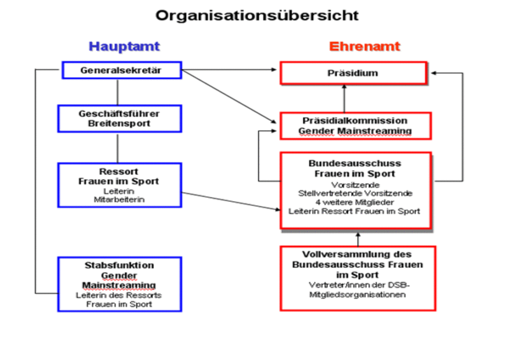 In der Geschäftsstelle des DSB ist der Aufgabenbereich "Frauen im Sport" im Geschäftsbereich 3 Breitensport ressortiert. Die hauptamtliche Leiterin des Ressorts verfügt als siebte Person über Sitz und Stimme im BA FiS und unterstützt die politische Arbeit mit fachlich-wissenschaftlicher Kompetenz. Darüber hinaus hat die Leiterin des Ressorts eins sog. Stabsfunktion Gender Mainstreaming inne, die dem Generalsekretär unterstellt ist. In dieser Funktion arbeitet sie mit der Präsidialkommission Gender Mainstreaming zusammen.