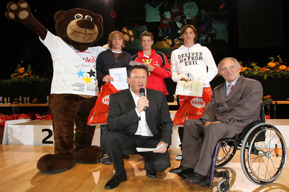 Bundesinnenminister Dr. Wolfgang Schäuble gratulierte den Jugend trainiert für Olympia"-Sporttalenten und war beeindruckt von der Stimmung in der Berliner Max-Schmeling-Halle. Zu seinem 65. Geburtstag wurde er mit einem Geburtstagsständchen von allen anwesenden rund 4.000 Sporttalenten und Ehrengästen überrascht. „Die Schülerinnen und Schüler haben sehr gute Leistungen im Sport erbracht, und jetzt können sie auch gemeinsam feiern. Wenn wir so begeisterungsfähigen und talentierten Nachwuchs haben, dann werden wir bei den Olympischen Spielen in Peking und in den Jahren danach sicherlich mithalten können.“ Bundesinnenminister Schäuble überreichte die Urkunden und Ehrenpreise an die Bundessieger im Tennis, die bei den Mädchen vom Staatlichen Heinrich-Heine-Gymnasium aus Kaiserslautern (Rheinland-Pfalz) und bei den Jungen von der Carl-Friedrich-Gauß-Schule aus Hemmingen (Niedersachsen) kommen.