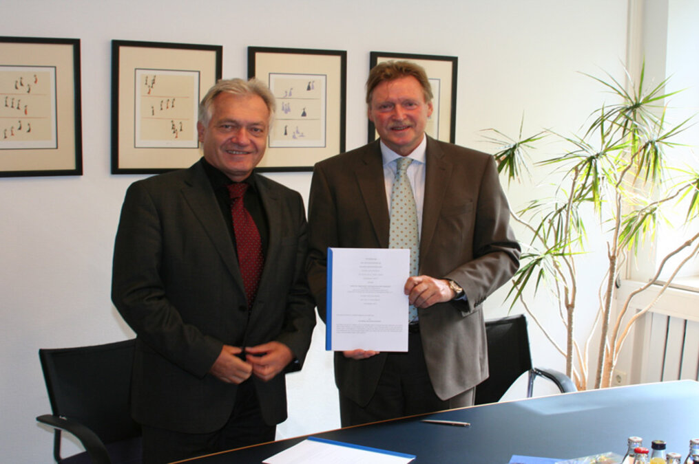 Zu diesem Zweck schlossen IAT-Direktor Professor Arndt Pfützner und der Rektor der DSHS Köln, Professor Walter Tokarski, eine Kooperationsvereinbarung. Kooperationspartner werden die Zentralbibliothek der Sportwissenschaften seitens der DSHS und der Fachbereich Information Kommunikation Sport (IKS) des IAT sein.