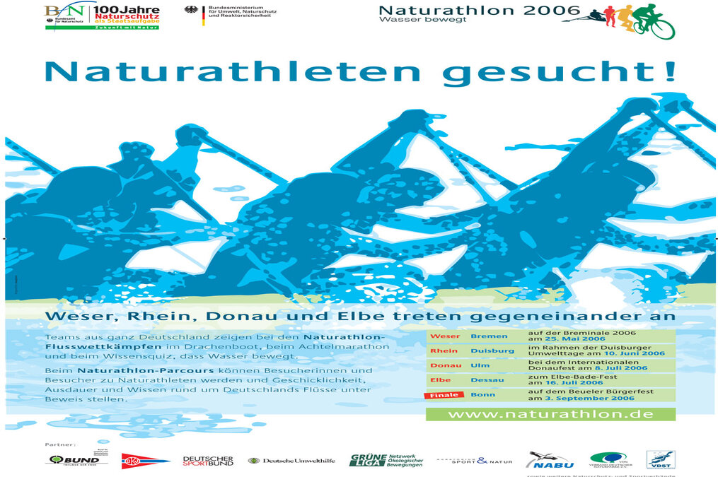 Anmelden können sich Teams ab sofort für die Flussgebietswettkämpfe am 10. Juni auf dem Rhein (Duisburg), am 8. Juli auf der Donau (Ulm) und am 16. Juli auf der Elbe (Dessau). Das "Naturathlonteam 2006" wird dann am 3. September in Bonn im Rahmen des "Beueler Bürgerfestes" gekürt. Bei diesem Finale werden alle erst- und zweitplazierten Teams aus den Flussgebietswettkämpfen gegeneinander antreten.