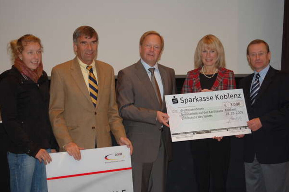 Im Rahmen einer Feierstunde in der Aula des Gymnasiums auf der Karthause Koblenz überreichte der Vorstandsvorsitzende der Sparkasse Koblenz, Manfred Graulich, dem Schulleiter des Gymnasiums, OStD Erik Babucke, die jährliche Projektförderung für Eliteschulen des Sports in Form eines symbolischen Schecks und übergab gleichzeitig die neue Beschilderung der Eliteschulen.