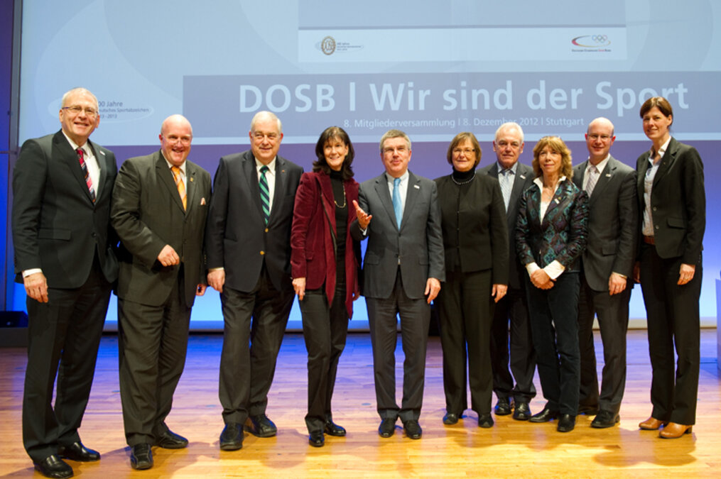 Wir im deutschen Sport schätzen Thomas Bach wie viele im internationalen Sport als echten Mannschaftskapitän, der stets den Dialog mit seinen Partnern sucht. Er hat sich große Verdienste um den deutschen und internationalen Sport erworben. So ist dank seines integrativen Führungsstils die Fusion von Deutschem Sportbund und Nationalem Olympischem Komitee reibungslos gelungen. Der DOSB ist heute, sieben Jahre nach der Fusion, eine wichtige Kraft in der Mitte der Gesellschaft und wächst entgegen dem demographischen Trend weiter. Mit fast 28 Millionen Mitgliedschaften in über 91.000 Vereinen und 98 Mitgliedsorganisationen ist der DOSB das Dach des deutschen Sports sowie die allseits anerkannte Stimme des Sports in Politik, Wirtschaft und Gesellschaft.