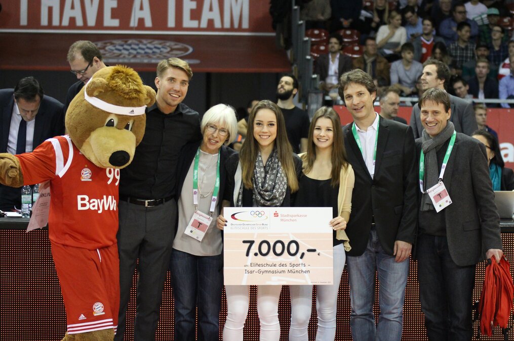 Für die Trampolin-Jugendweltmeisterinnen von 2014 im Synchron Aileen Rösler und Mona Weiler dürfte es ein Highlight ihrer noch jungen Sportlerkarriere gewesen sein. Die Münchner „Eliteschülerinnen des Sports“, bekamen im ausverkauften AUDI DOME vor 6.000 Zuschauern kurz vor Beginn des Basketball-Euroleague-Klassikers FC Bayern gegen Real Madrid die Auszeichnung ihrer Schule überreicht. Ebenfalls freuten sie sich über Sportlerrucksäcke und den Förderscheck für den Standort der Eliteschule des Sports, der vom Deutschen Sparkassen- und Giroverband bereitgestellt wurde. Dass man mit der Auswahl nicht ganz falsch gelegen ist, zeigt die Bronzemedaille, die die jungen Damen eine Woche zuvor bei der diesjährigen WM in Dänemark gewonnen hatten. Und da tat es dann auch keinen Abbruch, dass der FC Bayern das Match leider verlor.