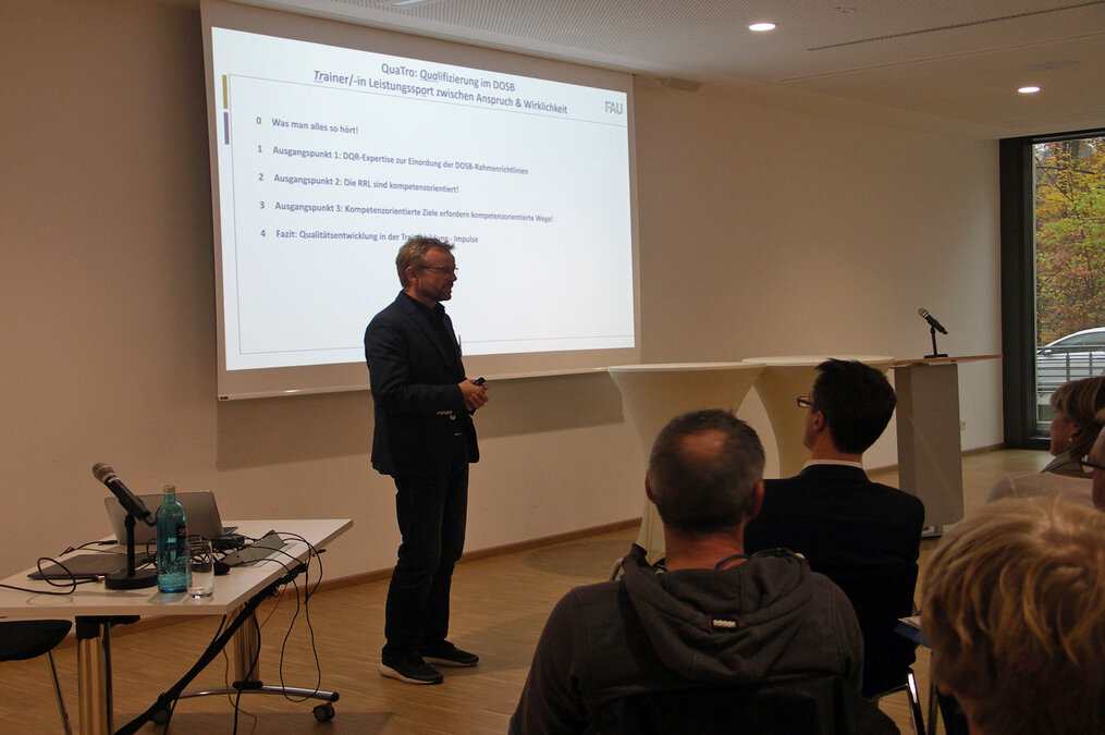 Es geht aber auch anders. Wie eine fruchtbare Kommunikation zwischen Sportwissenschaft und der Sportverbandsrealität gelingen kann, zeigte sich am vorigen Freitag in der „Arena“ des DOSB. Hier diskutierten Sportwissenschaftler mit Verantwortlichen für die Trainerausbildung in den Sportorganisationen die Ergebnisse der dreijährigen „QuaTro“-Studie, die durch die Förderung des Bundesinstitut für Sportwissenschaft (BISp) möglich wurde. Das Forscherteam, Prof. Dr. Ralf Sygusch und Raphael Ptack von der Friedrich-Alexander-Universität (FAU) Erlangen-Nürnberg, zeigte auf, was aus wissenschaftlicher Sicht in der Trainerausbildung gut läuft, allerdings auch, wo noch Verbesserungsbedarf ist.