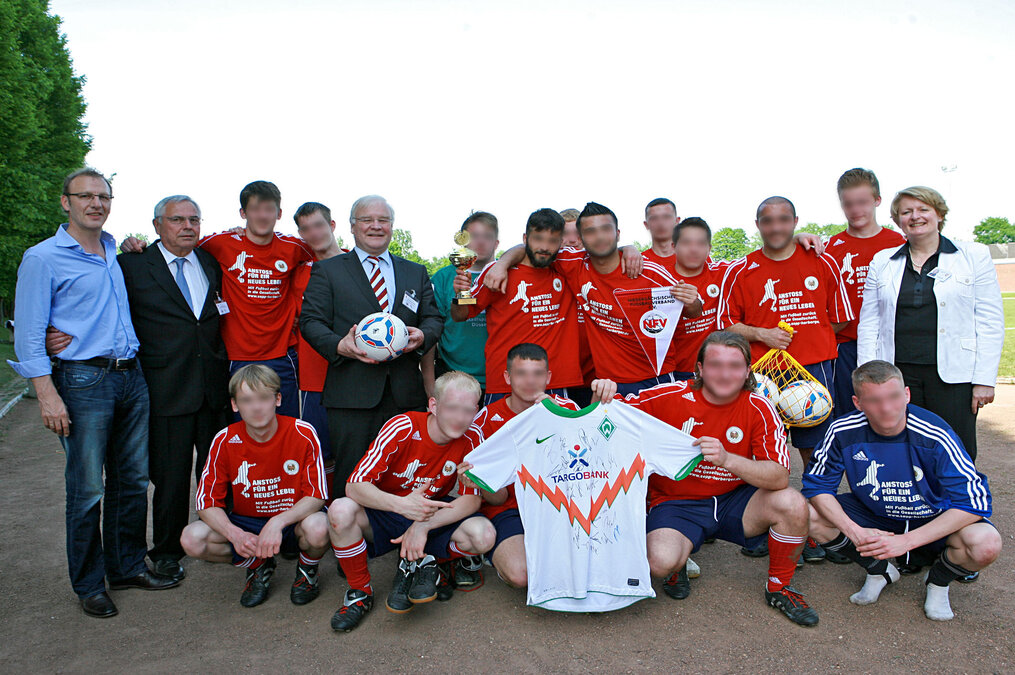 Der niedersächsische Justizminister Bernd Busemann und DFB-Vizepräsident Karl Rothmund haben am Dienstag (22. Mai 2012) in der Jugendanstalt (JA) Hameln den Startschuss für das Projekt „Anstoß für ein neues Leben“ gegeben. Ziel des Projektes ist es, jungen Gefangenen und Haftentlassenen systematische Unterstützung bei der sozialen und beruflichen Wiedereingliederung durch Akteure aus Sport, Justiz und Arbeitsmarkt zu geben. In Zusammenarbeit mit dem Justizministerium, der Bundesagentur für Arbeit, den teilnehmenden Justizvollzugs- und Jugendanstalten aus Hameln, Göttingen und Vechta sowie dem Niedersächsischen Fußballverband wird dieses bundesweit einzigartige Projekt nun auch in Niedersachsen umgesetzt.